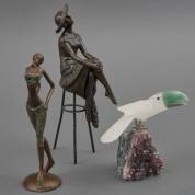 Drie diverse beeldjes: zittende vrouw op kruk, brons, in de stijl van Demetre Haralamb Chiparus (1886-1947), met gietersmerk van J.B. Deposée, Afrikaanse vrouw, brons, onderop gemonogrammeerd G.A., en gesneden natuurstenen beeldje van een toekan, zittend op een amethist, hoogte zittende vrouw 27 cm