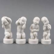 Vier witte porseleinen pijnbeeldjes: kiespijn, oorpijn, buikpijn en hoofdpijn, ontwerp Sven Lindhart, uitvoering Bing & Grondahl, Denemarken -kiespijn en buikpijn met randschilfer-,12 cm