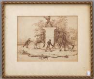 Inkttekening: spelende kinderen en een jager bij de letter 'J', m.o. gemonogrammeerd JW, 16 × 21,5 cm
