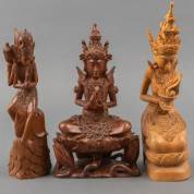 Drie gestoken houten beeldjes: Indra op lotustroon, alle Bali, eind 20e eeuw, grootste 29 cm hoog