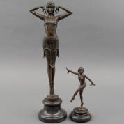 Twee bronzen beeldjes naar Demetre Haralamb Chiparus (1886-1947): grote poserende danseres, latere reproductie met signatuur en gietersmerk: J.B. Deposée, Paris, afmetingen inclusief basement 49,5 × 17,5 × 13 cm, en kleine danseres, niet gesigneerd, afmetingen inclusief basement 23 × 13 × 9,5 cm