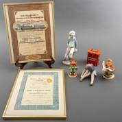 Twee aandelen: 'Meelfabrieken der Nederlandsche Bakkerij', en 'Cultuur Maatschappij Agredjo', daarbij: offerblikje 'Afrikaanse Missien', en vier porseleinen beeldjes, waaronder: Goebel en Lladró, hoogte grootste beeldje: 23 cm