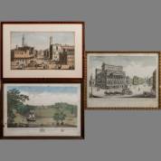 Drie ingekleurde gravures: 'Gezicht op de Badia in Florence', G. Zocchi, Italië 18e eeuw, 'Vue de Londres', B.F. Leizelt, 18e eeuw, 'Vue de la maison et du parc de Scoonenbergh', B.F. Leizelt -vochtplekjes-, 43,5 × 26,5 cm