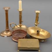 Vier messing kandelaars, een flessenbak en een dekseldoosje op klauwpootjes met gravering 'A.C. Fijp, te Twisk'