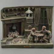 Metalen sculptuur met verlichting: man, vrouw en hond in woonkamer, naar Geo Maxim, Frankrijk, eerste helft 20e eeuw