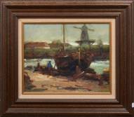 Willem Frederik Boekstal (1887-1957), binnenvaartschip bij molen, marouflé, r.o. gesigneerd en gedateerd 1927, 28,5 × 35,5 cm