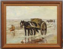 Hollandse School: schelpenvissers in de zee, olieverf op doek, niet gesigneerd, 30,5 × 40,5 cm