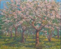 Hollandse School: bloesembomen in boomgaard, olieverf op doek, r.o. onduidelijk gesigneerd -vuil-, 50 × 40 cm
