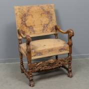 Bronskleurige gesneden notenhouten armstoel -speling in een armleuning, vlekken in bekleding-