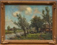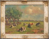 Barend Brouwer (1872-1936), landschap met rustende koeien en boerderijen, olieverf op doek, r.o. gesigneerd, 30 × 40,5 cm