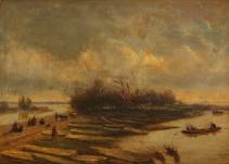 Johannes Pieter van Wisselingh (1812-1899), overstroming Bommelerwaard 1861, olieverf op paneel, r.o. gesigneerd en gedateerd 1861 -inschilderingen-, 27 × 38 cm