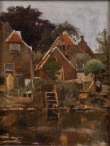 Hollandse School: kledingwassende vrouw bij het water achter het huis, marouflé, niet gesigneerd, circa 1900, 31 × 23 cm