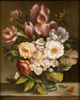 Hollandse School: bloemstilleven met vlinder, olieverf op paneel, r.o. gesigneerd M. Schreuder, tweede helft 20e eeuw