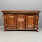 Lage eiken kast, het front en de deurtjes met panelen en op slotpoten, Hollands, samengesteld uit oude delen, -gebruikssporen-, 105 × 189 × 52,5 cm