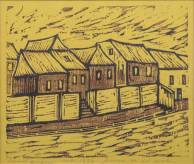 Vincent Derksen (1936), 'Huizen aan het water', linosnede, l.o. gesigneerd en m.o. gedateerd 1974, 26 × 32 cm