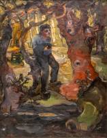 Vermoedelijk Oost-Europese School: post-impressionistisch landschap met centraal een boer met een haan in zijn handen, lopend door een bos, olieverf op doek, l.o. gesigneerd jKyh?, 126 × 100 cm