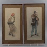 Herman Heijenbrock (1871-1948), twee werken: mijnwerker en mijnwerkersvrouw, gemengde techniek op papier, beide r.o. gesigneerd, 46 × 21