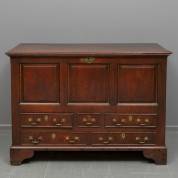 Eiken kist met onderin vijf lades, het geheel met messing beslag, Engeland, 18e eeuw -deksel kromgetrokken-, 98 × 141 × 56 cm