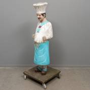Geverfd houten beeld: bakker, op karretje -stuk van hand afgebroken, krimpscheuren, verf sleets-, 165 cm