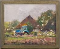 Judith Rigter (1956), landschap met tractor, olieverf op paneel, r.o. gesigneerd, 23 × 29 cm