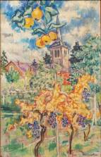 Kurt Hinrichsen (1901-1963), gezicht op een boomgaard met wijnranken en kerktoren in het verschiet, marouflé, r.o. gesigneerd, 48 × 31 cm