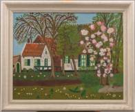Toegeschreven aan Anna Maria Zomer (1899-1970), boerderij bij de bloesembomen, olieverf op doek, niet gesigneerd, 40 × 50 cm