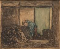 Willem de Zwart (1861-1931), boer in de stal met koe, kleurenets, r.o. gemonogrammeerd, 21,5 × 18 cm