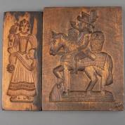 Twee houten dubbele koekplanken, waarvan één met decor van een fietser, 38,5 cm en 40 × 30 cm
