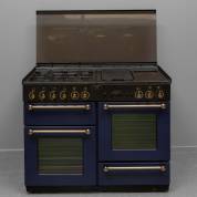 Blauw en zwart metalen vierpits gasfornuis met bakplaat, hotplate, drie ovens en een lade, gevuld met bakblikken en accessoires, uitvoering Atag, jaren '90/'00 -gebruikssporen, vervuiling-, 88 × 110 × 66 cm