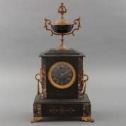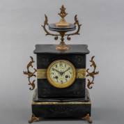 Schoorsteenklok in zwart marmeren kast, bekroond door een urn met verguld metalen monturen, eind 19e eeuw, kleine defecten, pootje los-, 47 cm hoog