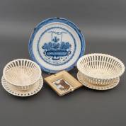 Twee creamware manden op onderschotels -één spijltje gelijmd-, Delfts aardewerk wandschotel met blauw-wit bloemenvaasdecor, 18e eeuw -barst-, en asbakje met luipaarddecor