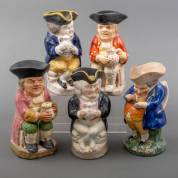 Vijf polychroom aardewerk 'Toby jugs', Staffordshire, Engeland, 19e eeuw -restauraties, gebruikssporen-, 24 × 16 cm