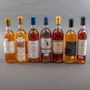 Zeven diverse flessen dessertwijn: Monbazillac, Cadillac, Loupiac, etc. -vulniveau's: top shoulder of hoger, één met gescheurd etiket-