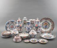 Negen polychroom gedecoreerde aardewerk schotels en borden, twee bedekte kastvazen, schenkkan, paar gemberpotten, bonbonnière, theebus, en twee kommen, alle met bloemdecor, uitvoering Koninklijke Tichelaar, Makkum, kastvaas 31,5 × Ø 16 cm -opbrengst ten bate van het Rijksmuseum Amsterdam-
