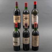 Zeven flessen rode wijn: Château Lynch-Moussas, Pauillac, zesmaal 1977 -vulniveau: high shoulder of hoger, etiketten zwaar gehavend-, en eenmaal 1962 -vulniveau: low shoulder, mogelijk herkurkt-
