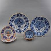 Paar aardewerk pauwenschotels met blauw-wit decor, paar aardewerk pauwenborden met polychroom decor, klein aardewerk pauwenbord met blauw-wit decor, alle gemerkt De Porceleyne Claeuw, daarbij: paar aardewerk wandbordjes, Koninklijke Tichelaar, Makkum -randschade, Makkum schaaltjes met glazuurschade aan de achterzijde-, schotel Ø 35 cm
