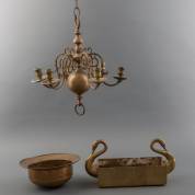 Zeslichts koperen kroon, koperen jardinière met handgrepen in de vorm van zwanen, en koperen zeef -kleine defecten-, jardinière 40 × 15 × 20 cm