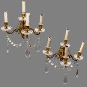 Paar vierlichts wandkroontjes met kristallen pegels -één fitting los-, 36 × 38 × 28 cm