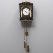 Wandklok in zwarte houten kast, email wijzerplaat met Romeinse cijfers, geflankeerd door twee porseleinen zuiltjes, Napoleon III, 19e eeuw -defecten-, 29,5 × 21,5 × 14 cm