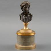 Rond verguld bronzen inktstel met reliëfdecor, bekroond door bronzen buste van een vrouw met lauwerkrans, eerste helft 19e eeuw, 30 × Ø 13,5 cm
