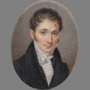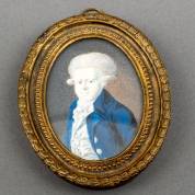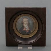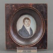 Miniatuurportret: man met naar voren gekamd haar, blauwe jas, wit vest met hoge kraag en halsdoek, eerste kwart 19e eeuw -zonder glas-, 5 × 4 cm