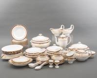 Uitgebreid beenderporseleinen serviesgedeelte, decor 'Cornucopia', uitvoering Wedgwood, bestaande uit: acht onderborden Ø 31 cm, vijftien dinerborden Ø 27 cm, vijftien ontbijtborden Ø 23 cm, veertien diepe borden Ø 23 cm, twaalf gebaksbordjes Ø 18 cm, negen bijzetbordjes Ø 15,5 cm, twaalf kommen Ø 15,5 cm, twaalf diepe schaaltjes Ø 13 cm, zeven eierdopjes, elf theekoppen en twaalf schotels, theepot, koffiepot, roomstel, en divers dienservies