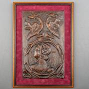 Eiken meubelpaneel met gesneden decor: vrouw en profil, bekroond door twee vogels, 17e eeuw, 35 × 21 cm