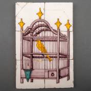 Zespas aardewerk tegeltableau met mangaanpaars decor: vogelkooi, 18e/19e eeuw -alle tegels met defecten-, 38 × 26 cm