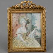 Miniatuurportret: vrouw met hoed, jurk en staf, gouache, r.o. gesigneerd MR Aslin, 18e/19e eeuw -rechts een vlek-, 9,5 × 8 cm, in striklijstje
