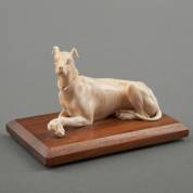 Ivoren beeldje: liggende hond, tweede helft 19e eeuw, op palissanderhouten basement -kopie CITES EU-certificaat bijgevoegd, geen uitvoer buiten de EU-, afmetingen hond 6,5 × 10,7 × 4 cm