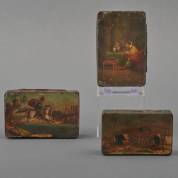 Drie blikken tabaksdozen met diverse beschilderde en gelithografeerde decors: schakende figuren in interieur -sleets-, slagveld, en cavalerist met getrokken zwaard, alle 19e eeuw, afmeting kleinste 2,3 × 11,5 × 7 cm