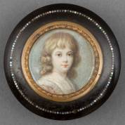 Schildpad doosje met miniatuurportret in het deksel: jongen met krullend haar, mogelijk Frankrijk, 19e eeuw -barst in het deksel-, Ø 6,5 cm