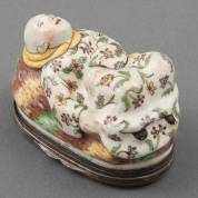 Porseleinen snuifdoosje in de vorm van een liggende figuur, met zilveren montuur, vermoedelijk uitvoering Saint-Cloud, Frankrijk, 18e eeuw, 5 × 7 × 4 cm
