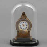 Miniatuur messing 'zappler' klokje met dubbele slinger, onder glazen stolpje, hoogte klokje 7,5 cm, totale hoogte 12 cm